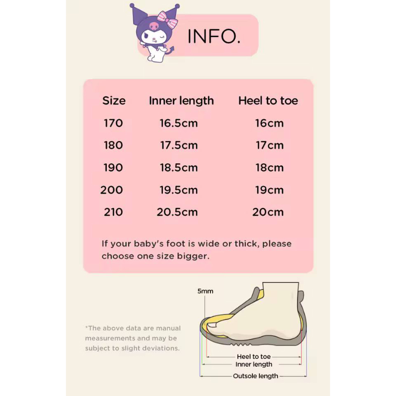 - سایزبندی کامل: یکی از مهمترین عواملی که در هنگام خرید رینبوت باید به آن توجه کرد، سایز مناسب است. رینبوتهای سری سانریو در مانلی شاپ با سایزبندی کاملی از سایز 170 تا 210 عرضه میشوند. این سایزبندی گسترده به شما این امکان را میدهد که رینبوتی با سایز دقیق پای کودکتان را به راحتی پیدا کنید. استفاده از رینبوتی با سایز مناسب، راحتی و سلامت پای کودک را تضمین میکند.