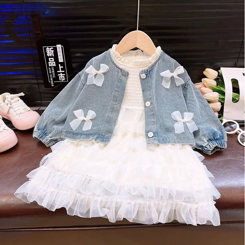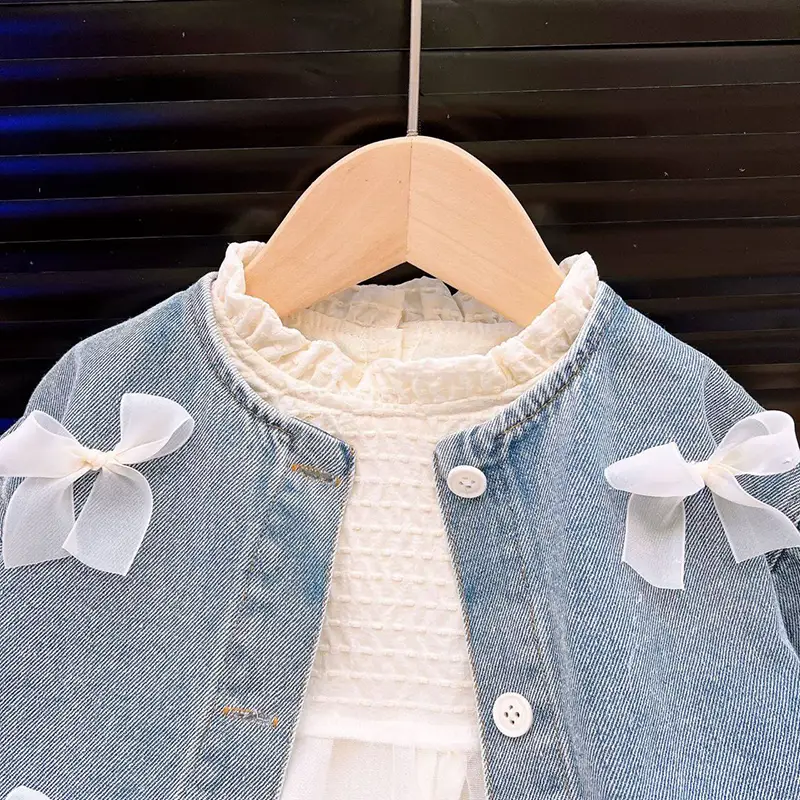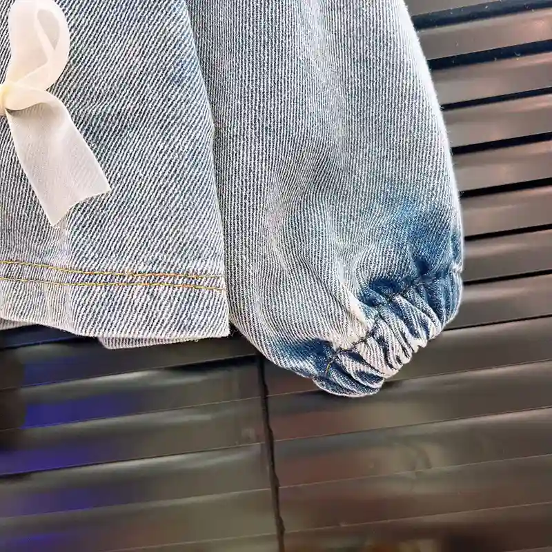 کت جین آبی با تزیینات زیبا: کت جین آبی رنگ با دکمههای سفید و طراحی ساده و شیک، برای تکمیل استایل کودک شما انتخابی عالی است. این کت دارای ربانهای سفید در قسمت جلو است که ظاهری دخترانه و جذاب به آن بخشیده است.