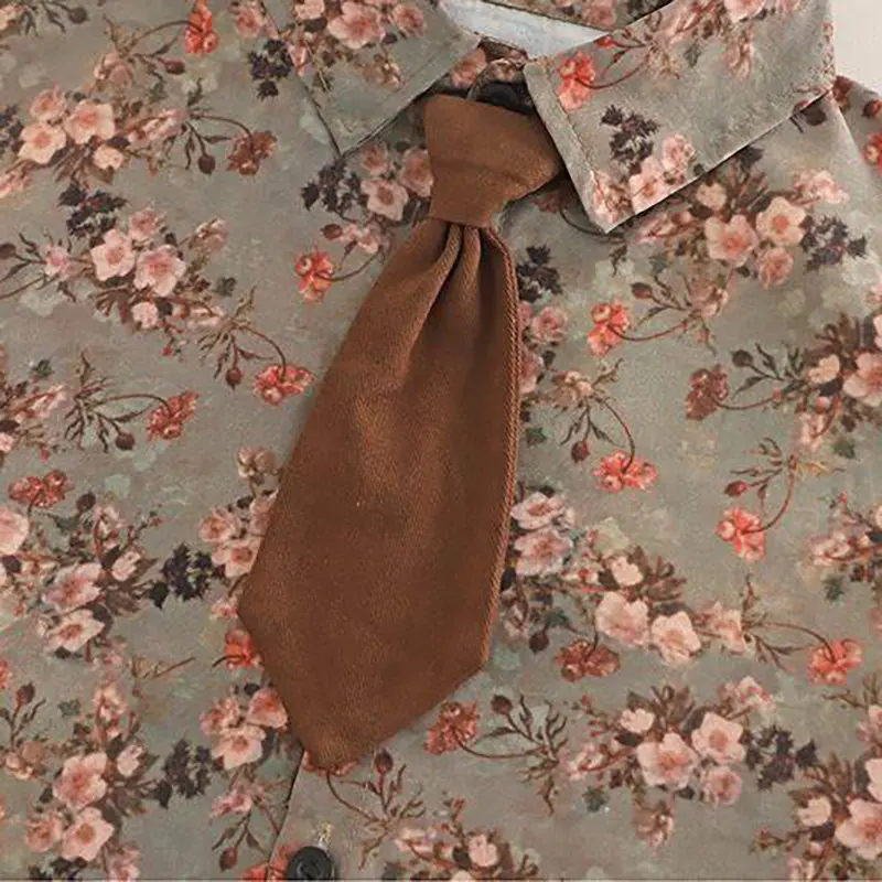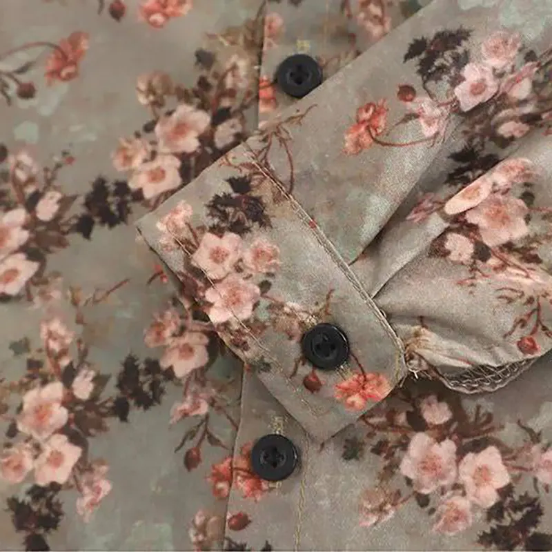 - شومیز گلدار با تم وینتیج: برخلاف مدلهای ساده، این شومیز دارای طرح گلدار بسیار ظریف و هنری با زمینه خاکیرنگ است که با دکمههای مشکی تضاد زیبایی ایجاد کرده است.